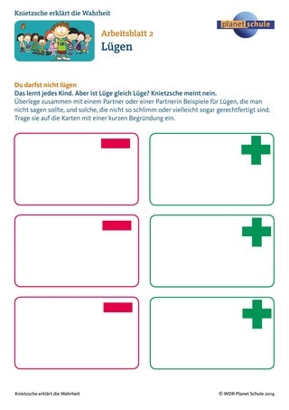 Knietzsche meint, dass nicht alle Lügen verwerflich sind. Die Klasse sammelt in Einzel- oder Partnerarbeit verschiedene Arten von Lügen – solche, die man nicht erzählen sollte und solche, für die es einen Grund gibt. Dazu können sie die Kärtchen nutzen, die auf Arbeitsblatt 2 "Lügen" vorgezeichnet sind. An einer Wandzeitung oder an der Tafel werden sie sortiert und besprochen. Einige Fälle werden diskutiert: Sind die Lügen entschuldbar oder nicht?