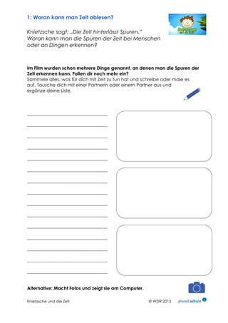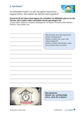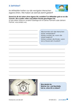 Wie haben die Menschen früher ihre Zeit eingeteilt, als sie noch keine Uhren hatten? Die Schüler*innen überlegen zu zweit und schreiben auf Arbeitsblatt 5 auf, was in einer Zeit ohne Uhren anders war. Sie überlegen sich Vor- und Nachteile von einem Leben ohne Uhren. Anschlussdiskussion über ein afrikanisches Sprichwort: „Die Europäer haben die Uhr, wir haben Zeit.”
