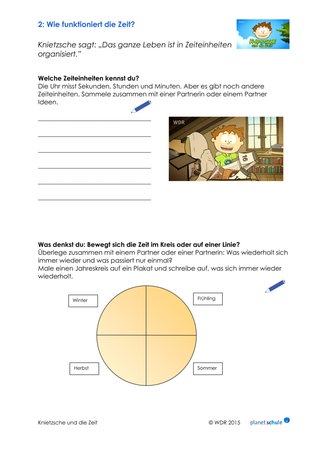 Welche Zeiteinheiten kennen die Schüler*innen? Wann bewegt sich die Zeit im Kreis und wann als gerade Linie? Die Schüler*innen sammeln auf Arbeitsblatt 2 verschiedene Zeiteinheiten und vergleichen ihre Listen zu zweit. Dann malen sie auf ein Plakat einen Jahreskreis und einen Zeitstrahl und tragen jeweils ein, was sich jährlich wiederholt und was nur einmal passiert.