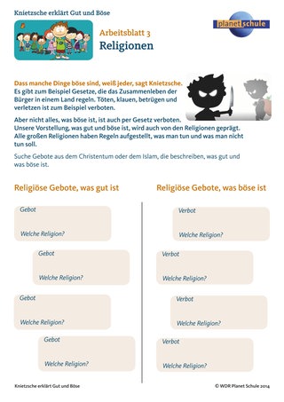 Dass Töten und Stehlen böse ist, darauf kann man sich schnell einigen. Dafür gibt es seit Jahrhunderten moralische Maßstäbe. Gesetze stellen Taten, die anderen Menschen oder der Allgemeinheit schaden, unter Strafe. In Religionen werden moralische Maßstäbe aufgestellt, was gutes und schlechtes Handeln ist. Die Schülerinnen und Schüler können die zentralen Gebote und Verbote im Christentum und Islam recherchieren (Arbeitsblatt 3 "Religionen"). Sind die Gebote im Islam dieselben wie im Christentum? Informationen darüber findet man unter anderem in der Reihe "Religionen der Welt".