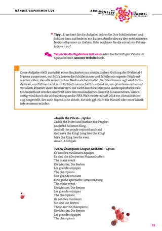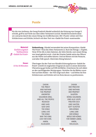 Sie setzen sich außerdem mit dem Text von "Zadok the Priest" auseinander, finden die Parallelen zwischen Händels Werk und der Champions League Hymne und komponieren selbst eine Hymne.
