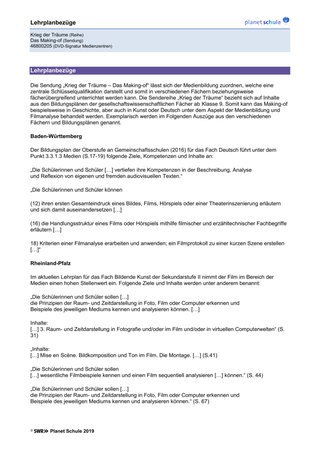 Die Sendung „Krieg der Träume – Das Making-of“ lässt sich der Medienbildung zuordnen, welche eine zentrale Schlüsselqualifikation darstellt und somit in verschiedenen Fächern beziehungsweise fächerübergreifend unterrichtet werden kann. Die Sendereihe „Krieg der Träume“ bezieht sich auf Inhalte aus den Bildungsplänen der gesellschaftswissenschaftlichen Fächer ab Klasse 9. Somit kann das Making-of beispielsweise in Geschichte, aber auch in Kunst oder Deutsch unter dem Aspekt der Medienbildung und Filmanalyse behandelt werden. Exemplarisch werden im Folgenden Auszüge aus den verschiedenen Fächern und Bildungsplänen genannt.