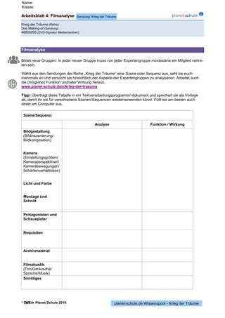Im nächsten Schritt soll das Gelernte (praktisch) angewendet werden. Die Schülerinnen und Schüler bilden neue Gruppen, wählen aus der Sendereihe „Krieg der Träume“ eine Szene oder Sequenz aus und analysieren diese mithilfe von Arbeitsblatt 4, dessen Tabelle als Vorlage in einem Textverarbeitungsprogramm beziehungsweise -dokument zur Wiederverwendbarkeit gespeichert werden sollte oder – falls möglich – auch direkt digital zur Verfügung gestellt werden kann.