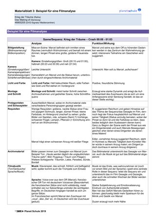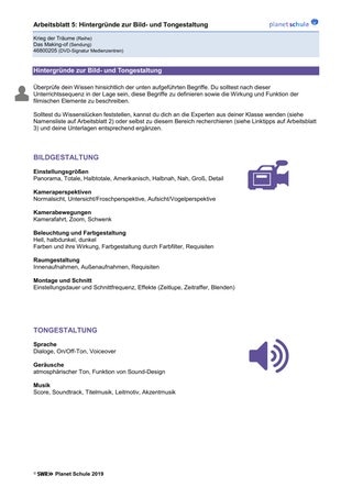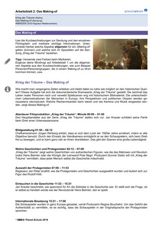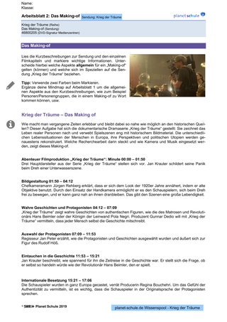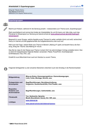 Auch wenn die Schülerinnen und Schüler sich bereits während des Filmes Notizen machen, wird es erforderlich sein, dass sie während des Arbeitens in den Expertengruppen einzelne Filmsequenzen noch einmal anschauen müssen. Für diesen Fall sollte die Sendung den Schülerinnen und Schülern zum Beispiel online zugänglich sein. Zudem sollte mindestens ein Computer mit Internetzugang pro Gruppe zur Recherche und Vorbereitung der Referate vorhanden sein. Für die Filmanalyse auf Arbeitsblatt 4 sollten alle Sendungen der Sendereihe „Krieg der Träume“ zur Verfügung stehen, damit die Schülerinnen und Schüler selbst eine Szene oder Sequenz zur Analyse auswählen können.