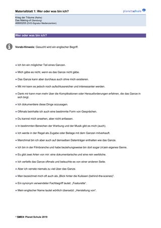 Sobald die Schülerinnen und Schüler den Begriff „Making-of“ erraten haben, sollten die einzelnen Sätze des Materialblattes 1 erneut (vor-)gelesen und gegebenenfalls im Plenum näher erläutert werden. Hilfreich ist es, wenn Materialblatt 1 per Overheadprojektor oder interaktivem Whiteboard präsentiert werden kann.