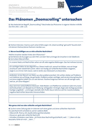 Die Schülerinnen und Schüler beschreiben das Phänomen „Doomscrolling“ auf Grundlage des Videos und tauschen sich über eigene Erfahrungen aus. Mithilfe von Arbeitsblatt 2 sowie der Filmsequenz (0:58–1:22) bearbeiten sie die Leitfrage: „Warum beschäftigen uns so viele schlechte Nachrichten?“ Dabei erarbeiten sie Ursachen wie den „Algorithmus“ (1:08–1:25), den problemorientierten Menschen sowie wirtschaftliche Interessen/Profitabilität anhand eines Textes. Anschließend recherchieren sie Beispiele für „positive“ und „negative“ Nachrichten (Zeitung/Internet) und analysieren diese, um die Unterschiede begründet zu unterscheiden und zu erkennen.