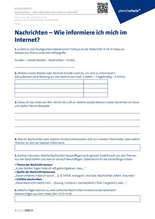 Die Lehrkraft startet das Video. Die Schülerinnen und Schüler setzen sich mithilfe von vier Begriffen und dem O-Ton (bis TC 0:18) gedanklich mit dem Thema auseinander. Anschließend werden die digitale Informationsbeschaffung, die Interessenlage der Schülerinnen und Schüler sowie ihre Empfindungen dazu im Plenum besprochen. Das Video und Arbeitsblatt 1 dienen dabei als Gesprächsgrundlage; die Beiträge und Ergebnisse werden gesammelt.