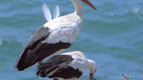 Ende August sammeln sich die Störche in großen Gruppen auf Wiesen . Der auslösende Faktor dafür dürfte ein innerer, hormonell gesteuerter Trieb sein. Sicher spielen aber auch die Witterung und das Nahrungsangebot eine Rolle. Dann machen sie gemeinsam die weite Reise nach Afrika . Die Weststörche – westlich einer Linie, die von Holland über den Harz zum Lech führt – fliegen über Gibraltar, die Oststörche über den Bosporus nach Afrika. Als ausgesprochene Segelflieger nutzen die Störche die Aufwinde der Landmassen und umfliegen das Mittelmeer. Die alten Störche kommen bereits im nächsten Frühjahr, ab Mitte März, meist jedoch Anfang April wieder, die Jungstörche bleiben vier oder fünf Jahre, bis sie erwachsen sind, dann kehren auch sie zurück – in den ersten Jahren oft nur bis in den Mittelmeerraum – , um hier zu brüten.