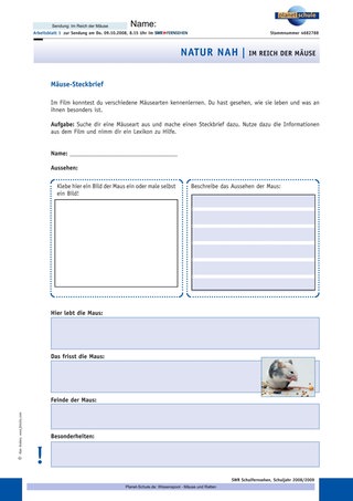 | Welche Mäusearten gibt es? (Arbeitsblatt 1) | Die Schüler erstellen in Einzel- oder Partnerarbeit Steckbriefe zu einer Mäuseart. Dabei nutzen sie Informationen aus dem Film und holen sich weitere Informationen aus Lexika oder dem Internet. In einem Buch werden alle Steckbriefe gesammelt. Durch ein Quiz mit Fragen zu allen Mäusearten halten die Schüler alle Ergebnisse im Überblick fest. | Die Merkmale einer Mäuseart herausarbeiten und im Vergleich mit anderen Vertretern Unterschiede oder Gemeinsamkeiten erkennen. |