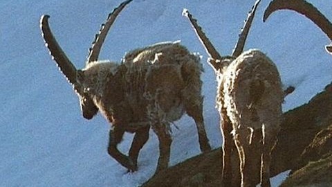 Steinböcke verbringen die warmen Tage eher faul; sie dösen in der Sonne. Nur einer darf nicht dösen – der Leitbock. Er wacht für alle anderen. Wird es dem Rudel zu warm, dann wandert es zum Rand der Schneefelder und verschafft sich dort etwas Kühlung. Ziehen im Juli Gewitter auf, dann schlägt sich dies in der Stimmung der Steinböcke nieder. Sie reagieren gereizt mit einem Spielkampf, bei dem durch Hörnerschlagen der Gegner geschwächt wird. Es handelt sich aber nur um ein Ritual, das den Gegner nicht vernichten soll. Vielmehr dient es als Übung für das Werben um Weibchen im Dezember. Dass wir heute die Böcke noch in freier Wildbahn beobachten können, ist nicht selbstverständlich. Vor etwa 150 Jahren hatten Wilderer und Trophäenjäger den Steinbock fast ausgerottet. Eine kleine Population von 59 Tieren hat im Gran Paradiso Park überlebt. Sie wurden vom italienischen König erfolgreich unter Schutz gestellt.