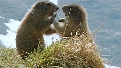 Erst Ende Mai kommt der Frühling in die Hochalpen. Die Temperaturen steigen, der Schnee schmilzt und das Leben erwacht. Es zeigen sich die ersten Murmeltiere vor ihrem Bau. Acht Monate lang hatten sich die Mitglieder der Großfamilie im Winterschlaf gegenseitig gewärmt. Während dieser Zeit haben sie ihr halbes Körpergewicht verloren. Nun spielen sie miteinander, wobei sie sich auch gelegentlich beißen. Im Spiel wächst die Rangordnung.
