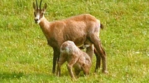 Gämsen sind ebenfalls im hochalpinen Bereich beheimatet. Ihre jungen Kitze spielen, fressen und ruhen den ganzen Tag auf den alpinen Matten. „Tanten“, das sind Geißen ohne Nachwuchs, beaufsichtigen die Jungen. Blütenpracht überzieht die Bergmatten. Das Berghähnlein und der Pyrenäenhahnenfuß erstrahlen in weiß, in feuchten Regionen blühen die Mehlprimel und der Stengellose Enzian. Die Alpenrose, ein Rhododendrongewächs, blüht im Hochsommer im Bereich der Wälder bis zu den hohen 3000ern.