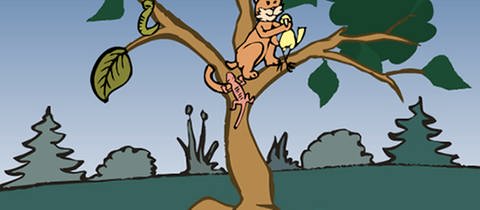 Wer frisst wen? Eine scheinbar friedliche Szenerie auf einer Waldlichtung: Eine Katze, ein Vogel, eine Eidechse, eine Raupe und mehrere Käfer haben sich rund um einen Baum versammelt. Durch Anklicken der verschiedenen Tiere starten witzige Animationen, die einen lehrreichen Einblick in eine typische Nahrungskette im Wald bieten.
