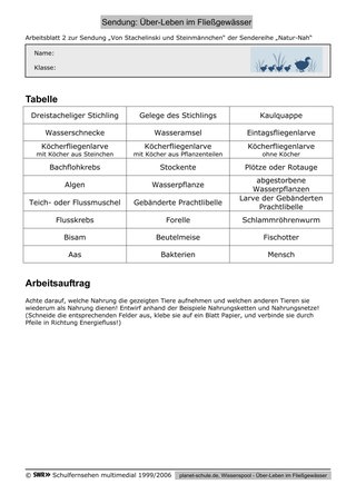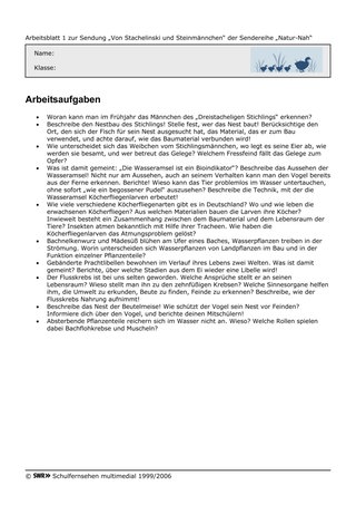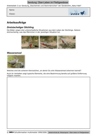Die Sendung ist so aufgebaut, dass der Lehrer einzelne Abschnitte des Films unabhängig voneinander in seinem Unterricht einsetzen kann: So lassen sich z.B. Aussehen und Verhalten des Stichlingsmännchens im Frühjahr beobachten und beschreiben, an einem anderen Teilstück können die Artmerkmale der Wasseramsel, ihre Fangtechnik und andere typische Verhaltensweisen erarbeitet werden, die Anpassung einer im Wasser lebenden Insektenlarve an ihren Lebensraum kann an einer Reihe von Köcherfliegenlarven gezeigt werden, oder eine weitere Sequenz eignet sich zum Kennenlernen des Süßwasserkrebses und seiner Art, Nahrung aufzunehmen. Natürlich kann der Film auch als Ganzes zum Einsatz kommen, wobei verschiedene Verfahren denkbar sind: Zum Beispiel kann man vor einzelnen Abschnitten allen Schülern gleichlautende Fragen stellen bzw. Arbeitsaufträge geben, deren Antworten bzw. Ergebnisse nach jeder Einspielung verglichen und – möglichst an der Tafel – festgehalten werden. Um den Film als Ganzes zeigen zu können, dem Schüler faszinierende Einblicke in die Lebensgemeinschaft eines Fließgewässers zu ermöglichen und ihn nicht gleichzeitig mit allzu vielen Fragen zu binden, aber trotzdem für die Klasse ein Optimum herauszuholen, ist es vorteilhaft, die Schüler in unterschiedlich große Gruppen einzuteilen und diesen Gruppen jeweils eigene Arbeitsaufträge zu geben. Am Ende der Stunde ist für die Schüler Gelegenheit, sich in den Gruppen auszutauschen und einen Sprecher zu wählen, der in einer zweiten Stunde der Klasse die Ergebnisse vorträgt, z.B. in Form eines Referates, unterstützt durch geeignete Abbildungen und einen kurzen Tafelanschrieb.