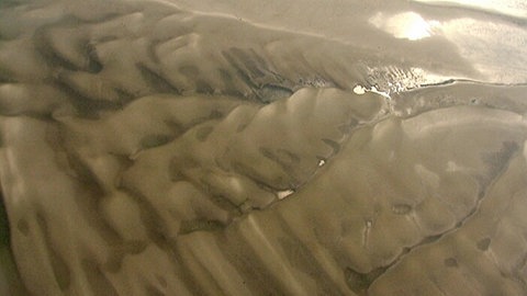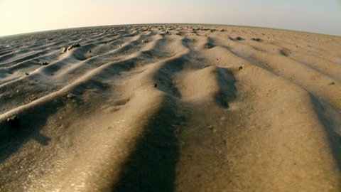 2. Sandwatt findet man in Gebieten mit starken Wasserbewegungen, denn hier können sich nur schwerere Sedimente mit größeren Korngrößen von über 0,1 mm ablagern. Die starken Wasserströmungen - und somit das Sandwatt - findet man vor allem in und um das Rinnensystem. Erkennen kann man Sandwatt an der typischen Rippenstruktur. Es ist relativ fest und gut begehbar.