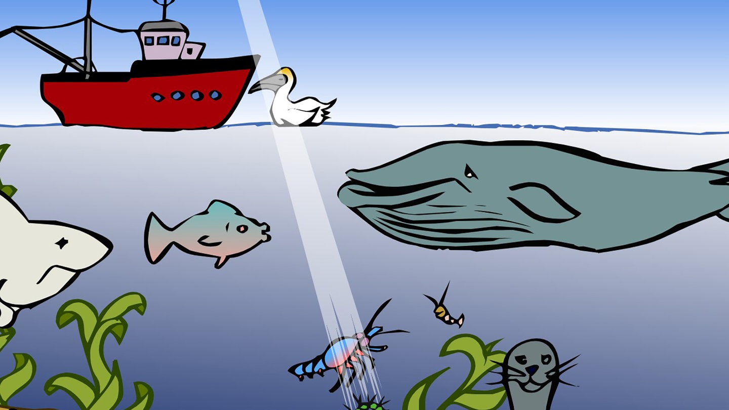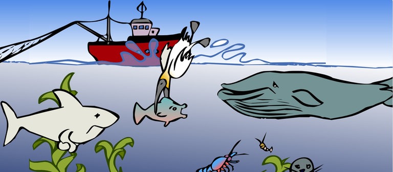 Ob Krebs, Seehund oder Wal – alle Lebewesen im Meer stehen über den Nahrungskreislauf miteinander in Verbindung. In der witzigen Animation können die Nahrungsbeziehungen des Lebensraums erforscht werden:
