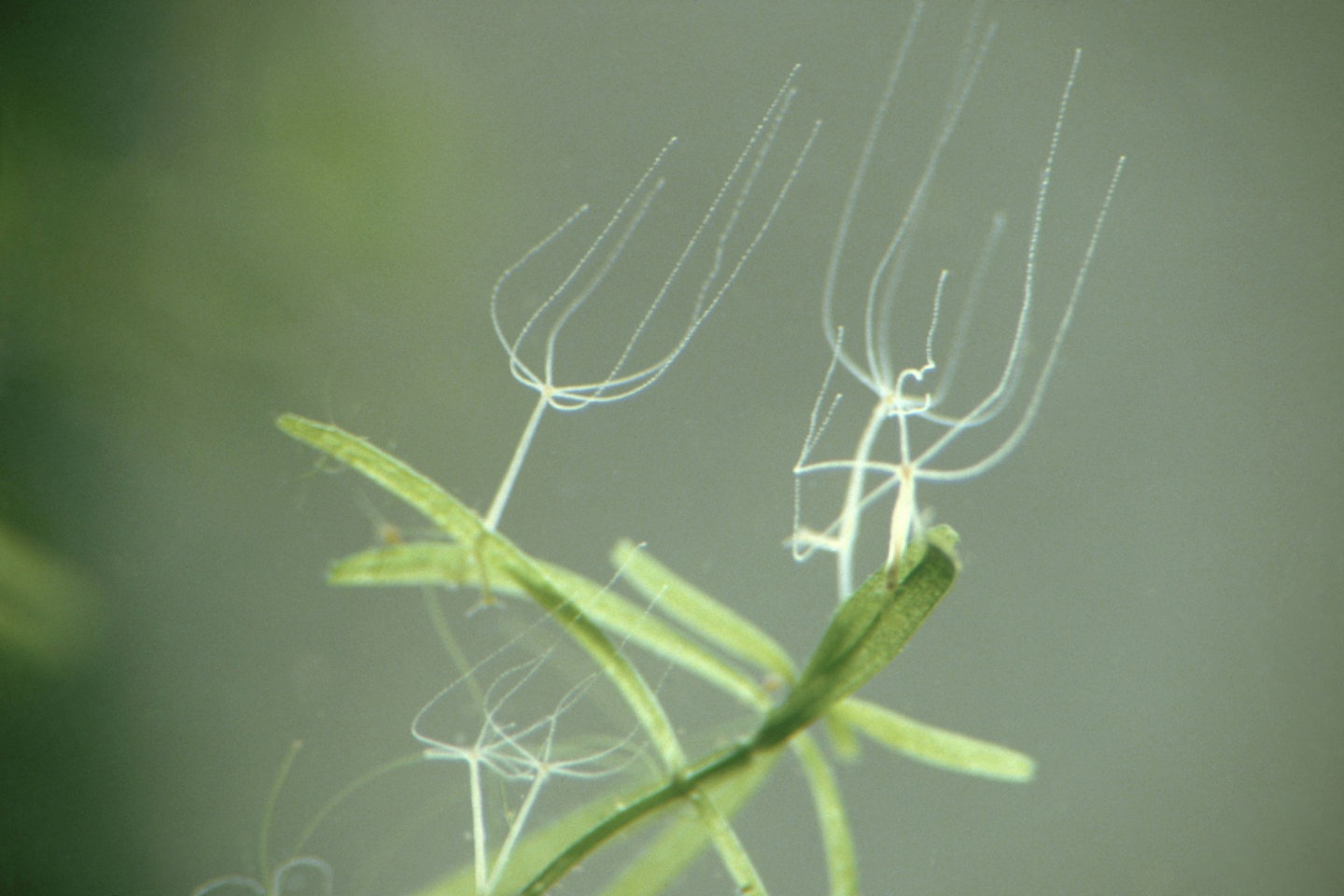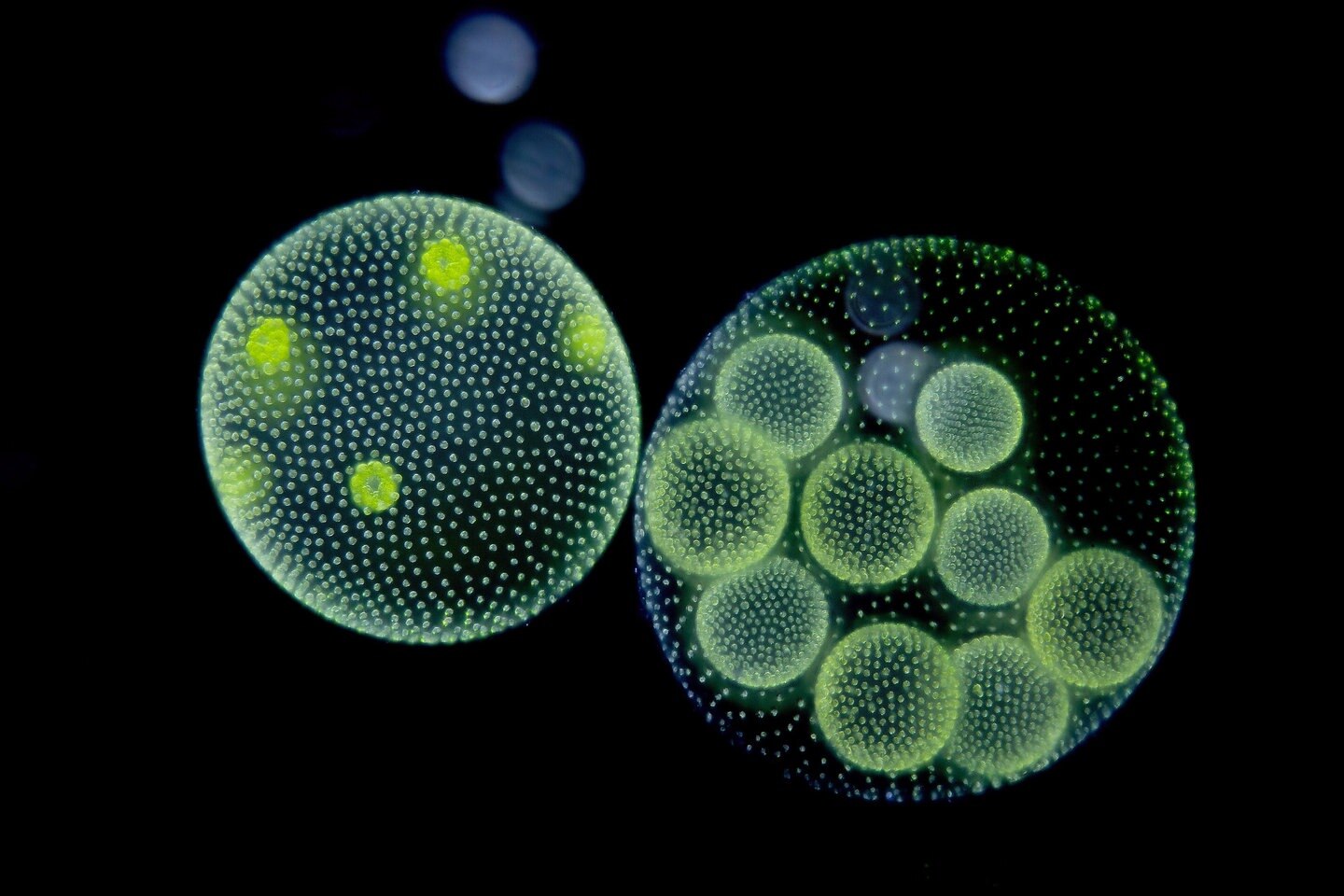 Ein Beispiel für eine planktonische Grünalge ist die Goldene Wimperkugel (Volvox aureus). Sie bildet Kolonien aus 500-1.500 einzelnen Zellen, die man mit dem bloßen Auge sehen kann. Die Zellen sitzen alle in einer gallertartigen Schicht, die eine Hohlkugel umschließt. Die Zellen sind mit Schleim- oder Plasmafäden miteinander verbunden. Aus jeder Zelle ragen zwei Geißeln (die „Wimpern") ins Wasser und gemeinsam können die Zellen die Kugel bewegen. Es kommt bei Volvox zum ersten Mal in der Evolutionsgeschichte zu zwei interessanten Begebenheiten. Zum einen haben einzelne Zellen eine Spezialfunktion: Es gibt Vermehrungszellen, die Tochterkugeln ausbilden. Zum anderen begegnet man bei Volvox zum ersten Mal dem Tod eines Organismus. Andere Kleinstlebewesen teilen sich in identischen Kopien endlos weiter oder bilden irgendwann Sporen. Ein direkter „Tod“ eines Individuums ist nicht wirklich nachzuweisen. Bei Volvox stirbt die Mutterkugel aber definitiv ab: Sie zerreißt, wenn die Tochterkugeln entlassen werden.