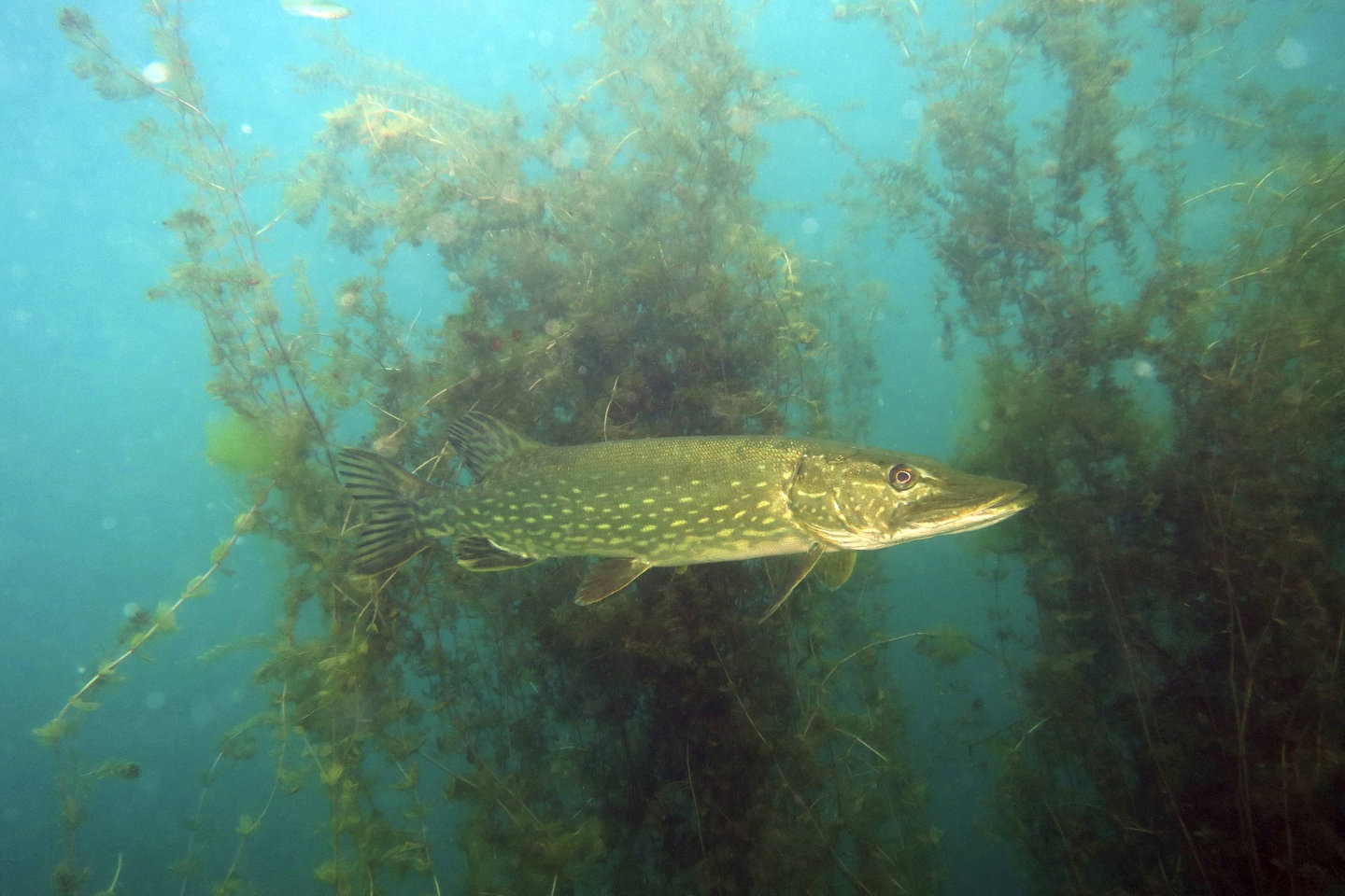 Der Hecht ist der wohl gefräßigste Raubfisch in unseren Seen. Er wird bis 1,20 m lang und 25 kg schwer. Er hat einen langgestreckten Körper, einen verlängerten Unterkiefer und ein tiefgespaltenes Maul mit vielen großen und kleinen Zähnen. Die Farbe des Rückens variiert zwischen oliv, braun und graugrün. Die Seiten sind heller mit typischen dunkleren Querstreifen. Der Hecht versteckt sich gerne zwischen Wasserpflanzen und lauert seiner Beute geduldig auf. Er frisst alles, was in sein Maul passt - von Fischen, Lurchen über Wasservögel bis zu Kleinsäugern.