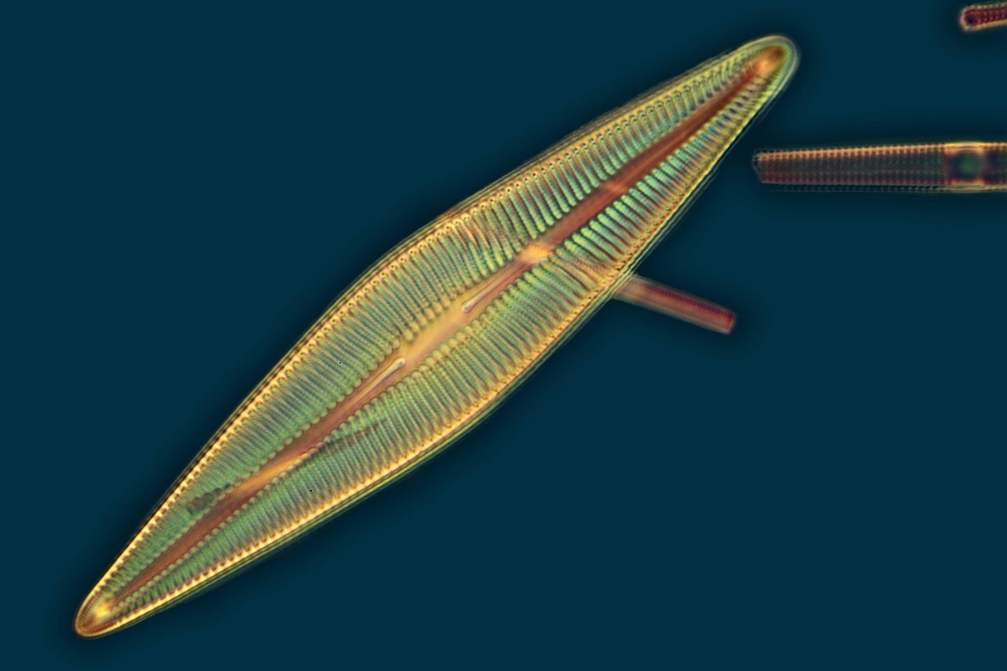 Kieselalgen sind faszinierende, einzellige Algen. Trotz ihrer geringen Größe sind sie mit den großen braunen Tangen verwandt. Einmalig im Pflanzenreich ist ihre glasklare, feste Zellwand, in die Kieselsäure eingelagert ist. Wie bei einer Schuhschachtel gibt es einen Deckel und einen Boden. Eigentlich erinnert das Gehäuse an ein kleines Glashaus, das auffällig mit Löchern und Rillen verziert ist und in dem ein kleines braungrünes Lebewesen wohnt. Kieselalgen sind Einzeller. Manche Arten bilden aber auch Kolonien. Von den bisher weltweit bekannten 10.000 Arten leben nur etwa 200 in unseren heimischen Gewässern. Es gibt zwei Gruppen von Kieselalgen: Zu der einen Gruppe gehören runde Kieselalgen (Centrales), die aber hauptsächlich im Meer vorkommen. Die Vertreter der zweiten Gruppe (Pennales) haben eine längliche Form und leben vor allem am Gewässerboden. In ihrer Schale kann man eine kleine Rinne (Raphe) sehen, die von einem zum anderen Ende führt. Aus dieser Rinne tritt Schleim aus, auf dem die Alge gleiten kann.
