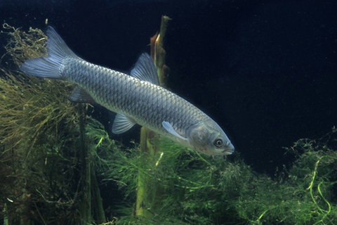 Der Graskarpfen ist ein nicht-heimischer Karpfen, dessen Herkunft nicht mehr genau zu bestimmen ist. Allerdings weiß man, dass er bereits im 10. Jahrhundert in China gezüchtet wurde. Er wird maximal 1,20 m groß. Der Graskarpfen hat einen gestreckten Körper und eine stumpfe Schnauze. Er hat im Gegensatz zu den meisten Karpfen keine Bartfäden. Der Graskarpfen hat große, dunkel umrandete Schuppen. Der Rücken ist dunkelgrün bis grünschwarz mit hellen Seiten und einem weißlichen Bauch. Er bevorzugt ruhige, tiefe, warme Flüsse. Der Graskarpfen zeichnet sich dadurch aus, dass die Jungfische Kleintiere fressen, die Erwachsenen aber Pflanzen verspeisen. Wo Graskarpfen ungewollt auftauchen, können sie zum ökologischen Problem werden: Sie machen aus einem See eine Unterwasserwüste, indem sie sämtliche Pflanzen und Algen auffressen.