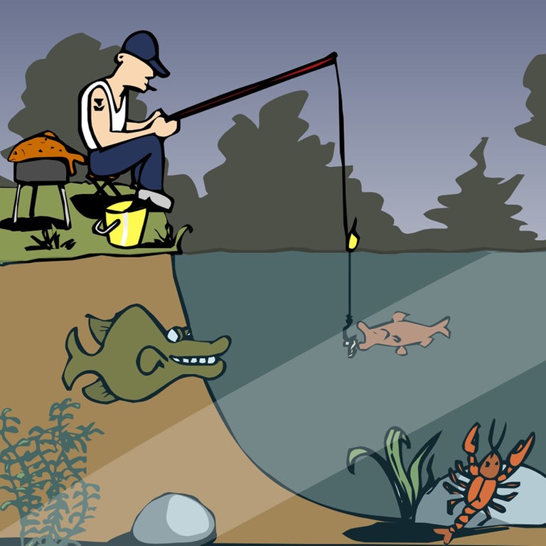 Die Bedienung der interaktiven Animation ist intuitiv: Einfach das gewünschte Tier anklicken und schon kann man einen Teil der Nahrungskette erleben. Kaulquappen zum Beispiel werden von den Insektenlarven des Gelbrandkäfers gefressen, während der Hecht sich als Raubfisch von anderen Fischen ernährt. Am Ende der Nahrungskette steht der Mensch, der mithilfe seiner Angel den Hecht fängt. Die Reste seiner Mahlzeit werden von Destruenten wie Würmern, Insekten oder Krebsen zersetzt, wodurch sich der Nahrungskreislauf schließt.