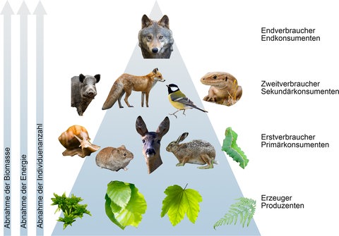 Eine zentrale Rolle bei der Beantwortung spielt die Fotosynthese. Pflanzen sind als einzige Lebewesen dazu in der Lage, die Energie des Sonnenlichtes zu nutzen, um aus Wasser und Co2 Zucker herzustellen. Sie werden deshalb als Primärproduzenten bezeichnet und stehen ganz am Anfang der Nahrungskette. Tiere am Ende der Nahrungskette („Endverbraucher“) werden zwar nicht gefressen, müssen aber dennoch sterben. So genannte „Destruenten“ sorgen dann dafür, dass der tote Körper eines Endverbrauchers zersetzt wird und damit dem Nahrungskreislauf im Wald wieder zur Verfügung steht.