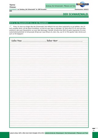 Zur Bestätigung der erarbeiteten Informationen wird der Film nun ein zweites Mal geschaut. Die Vierer-Gruppen bleiben zusammen und formulieren ein Schreiben an die Klassenlehrerin/den Klassenlehrer, in welchem für einen Landschulheimaufenthalt im Schwarzwald geworben wird (Arbeitsblatt 6). Die Teams sollen dabei sachbezogen argumentieren und so die gewonnenen Erkenntnisse umsetzen.