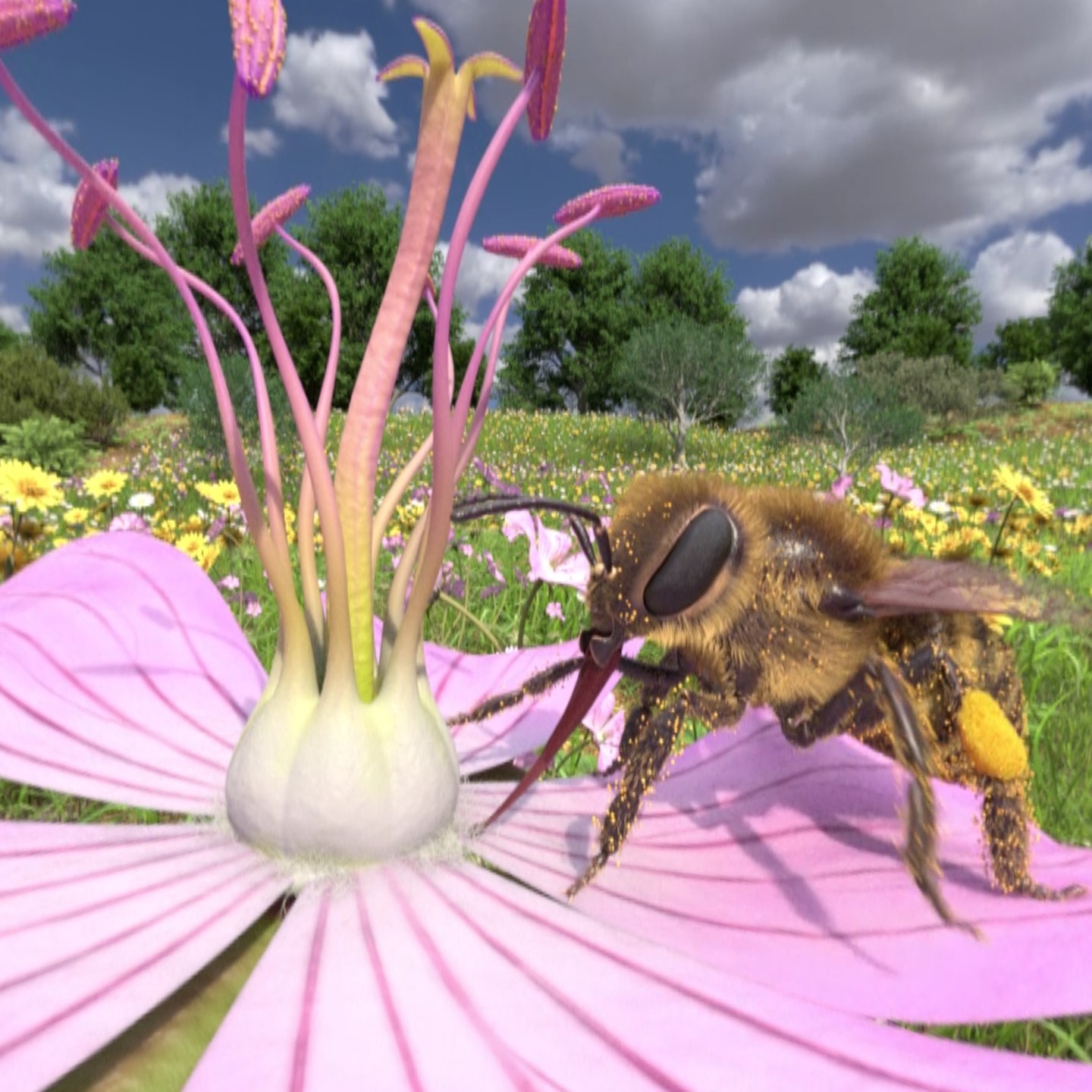 Durch die Drehung des Kopfes wird das Erlebnis in der 3D-Erlebniswelt individuell gesteuert. Verschiedene Arbeitsbereiche der Bienen locken mit anschaulich animierten Szenarien. So kann man die Bienen bei der Nahrungssuche auf der Blumenwiese beobachten, beim Wabenbau im Inneren des Bienenstocks, bei der Eiablage der Bienenkönigin oder bei der Fütterung der Larven in den Waben.