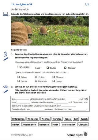 Die Schüler:innen beginnen ihre virtuelle Erkundungstour auf einer Wildblumenwiese. Hier bekommen sie die ersten Informationen über das Leben der Honigbienen und können im Anschluss Arbeitsblatt 1 in Einzelarbeit bearbeiten.