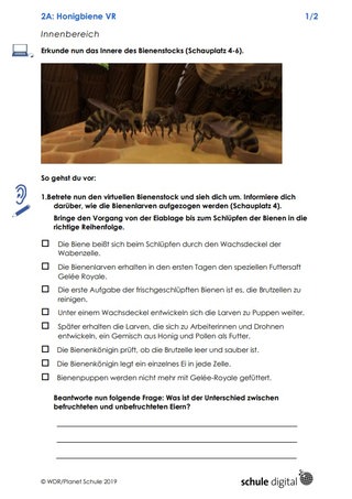 Mit der App "Honigbiene VR" im Unterricht den virtuellen Bienenstock besuchen! Das Unterrichtsmaterial kann für die Klassen 5 und 6 in Biologie oder für eine Bienen-AG genutzt werden. Die Schüler:innen erkunden den Lebensraum der Honigbienen und entdecken verschiedene Stationen innerhalb des Bienenstocks.