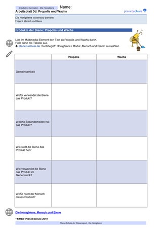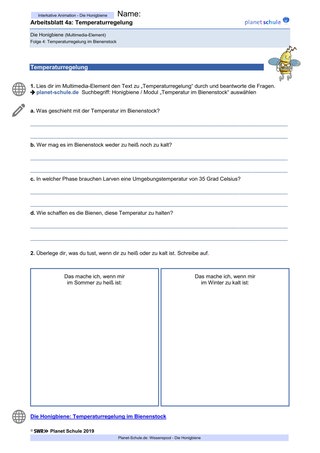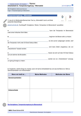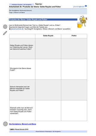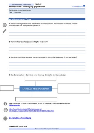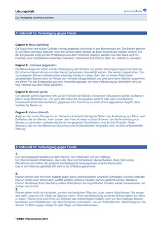 Gleichwohl sorgt ein Übersichtsblatt für die Wissenssicherung aller vier Bereiche und gibt den Schülern einen Gesamtüberblick zum Thema Honigbiene. Es wird empfohlen, die Honigbiene zuerst allgemein einzuführen, bevor dann auf die Multimedia-Elemente zugegriffen wird. Die Bearbeitung kann in Form einer Lerntheke stattfinden, wobei die Reihenfolge der Themen eine untergeordnete Rolle spielt. Allerdings sollten die Arbeitsblätter der jeweiligen Themenbereiche nach der Reihenfolge (a,b,c…) bearbeitet werden, da sie aufeinander aufbauend erstellt wurden.