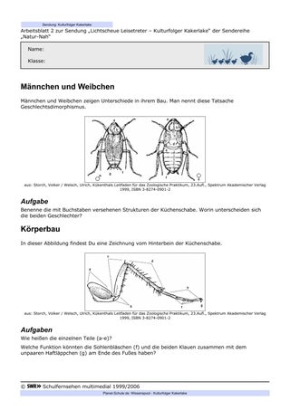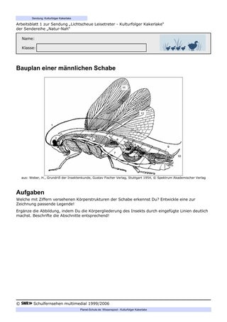 - Das Arbeitsblatt „Bauplan einer männlichen Schabe” zeigt deutlich die Dreigliederung des Insektenkörpers in Kopf, Brust und Hinterleib. Am Kopf sitzt ein körperlanges Fühlerpaar und an den drei Brustringen je ein Beinpaar, außerdem an den beiden hinteren Brustringen je ein Flügelpaar. Neben dem gegliederten Aufbau des Körpers stellt die Abbildung auch Röhrenherz und Strickleiter-Nervensystem vor. Magen-Darmtrakt und Geschlechtsorgane runden das Bild ab. Um das Blatt übersichtlich zu halten, fehlt das Tracheensystem.