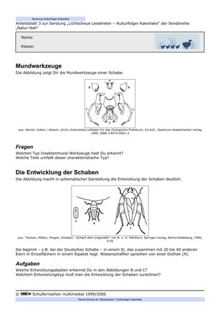- Zwei Unterrichtswege bieten sich an: Zuerst wird der Körperbau des Insekts mit Hilfe von Abbildungen, Präparaten, Arbeitsblättern usw. entwickelt. Das Verhalten der Schaben wird anhand konkreter Arbeitsaufträge über das Medium Film beobachtet und beschrieben. Der andere Weg steigt, ebenfalls mit Fragestellungen und Arbeitsanweisungen, über den Film ein. Arbeitsblätter, Tafelbilder, Texte sichern die Unterrichtsergebnisse.