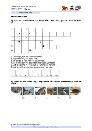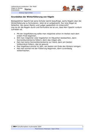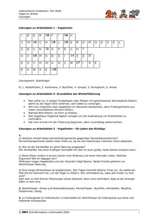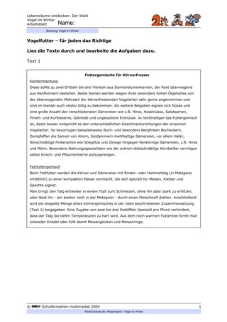 - a) Der Lehrer/die Lehrerin kann z.B. den Auftrag erteilen, in Gruppenarbeit die Informationen aus dem Film über eine sinnvolle Fütterung zusammenzutragen und Plakate mit dem Thema "Winterfütterung der Vögel" anzufertigen, die der Öffentlichkeitsarbeit dienen sollen. Sie können in der Schule aufgehängt werden, noch motivationsfördernder wären aber Orte, die mehr Menschen zugänglich sind, z.B. Schaufenster von Geschäften oder Schaukästen an öffentlichen Gebäuden. Wichtig ist, dass bereits geklärt ist, wo die Plakate hängen werden und dass es sich um sichere Orte handelt.