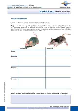| Sind Ratten und Mäusen eigentlich das gleiche? (Arbeitsblatt 3) | Die Schüler notieren in Einzel- oder Partnerarbeit auf einem Arbeitsblatt die Merkmale von Ratten und Mäusen im Vergleich. | Die Unterschiede zwischen Mäusen und der Unterart Ratte kennen. |