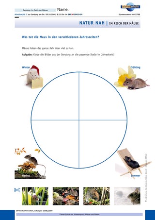 | Was tut die Maus in den verschiedenen Jahreszeiten? (Arbeitsblatt 2) | Mit Hilfe von Bildern, die das Tun der Mäuse zeigen, entsteht an der Tafel ein Jahreszeitenkreis. Die Schüler erzählen, was sie aus dem Film darüber wissen. Auf einem Arbeitsblatt halten sie die Ergebnisse dann fest. | Die Anpassung der Mäuse an die jahreszeitlichen Besonderheiten erkennen und die Maus als Beispiel eines winteraktiven Tieres kennen. |