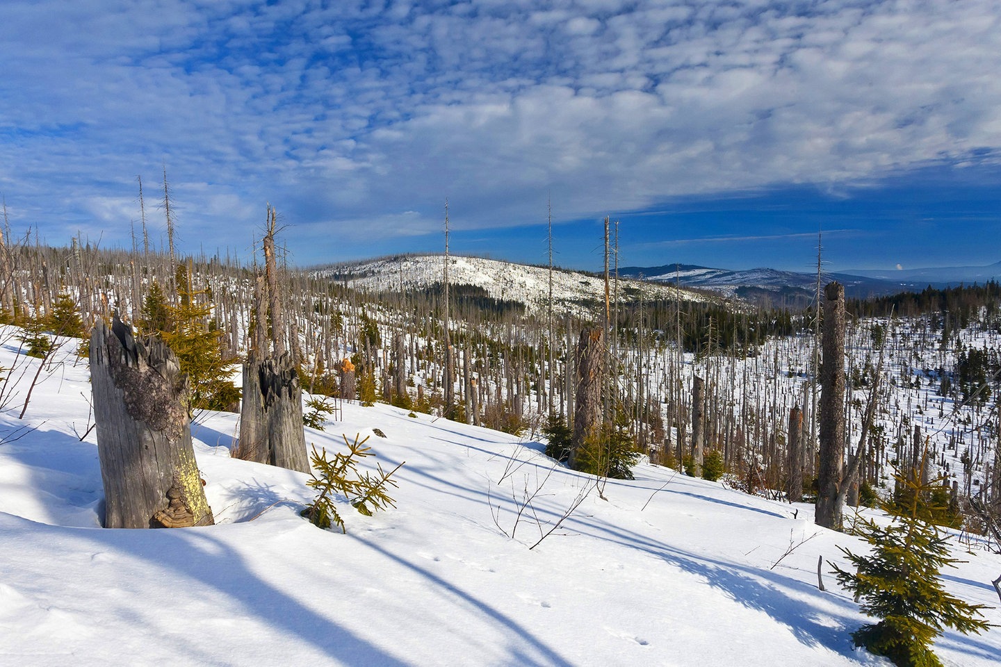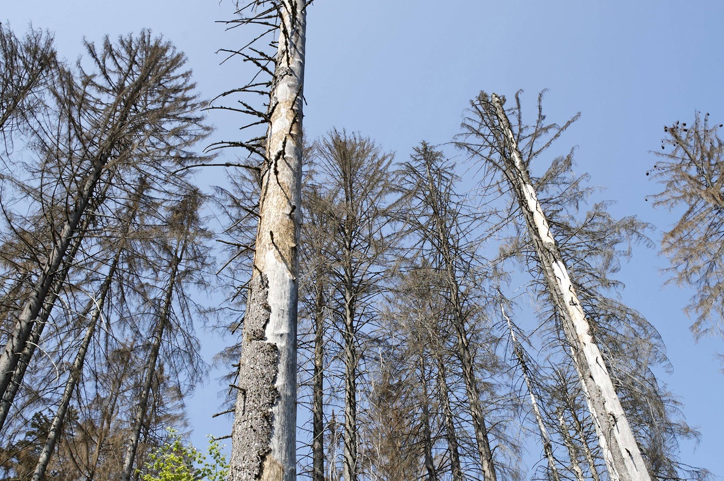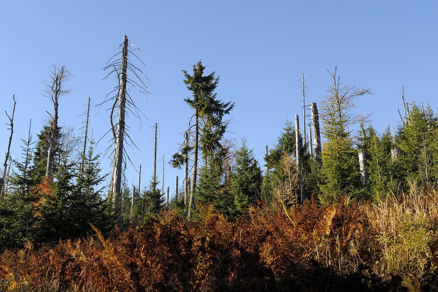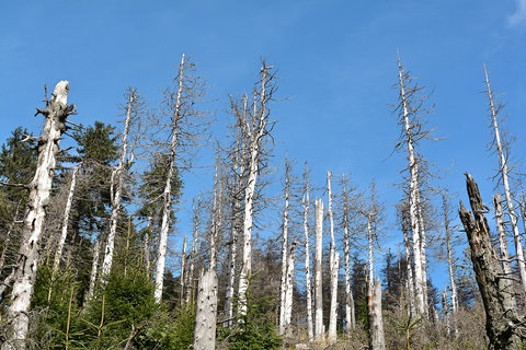 Mit solchen Bildern und Gedanken haben die Menschen sich beschäftigt, als Mitte der 1980er-Jahre die Waldschäden für jeden sichtbar wurden. Damals erkannte man, dass mehr und mehr Bäume in Mitteleuropa erkrankt waren. Die schlimmsten Schäden traten im ehemaligen Ostblock auf. Vor allem im Erzgebirge waren manche Hänge großflächig mit Baumgerippen übersät. Bilder von solchen "Waldwüsten" kursierten fast täglich im Fernsehen und in Zeitungen. Die Menschen waren geschockt und zweifelten nicht mehr daran, dass man von einem echten Waldsterben sprechen musste.
