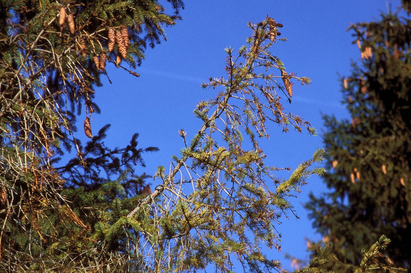 In der Bundesrepublik sah die Situation damals zwar etwas günstiger aus als in der DDR, sie war aber trotzdem besorgniserregend. Wenige Bäume waren wirklich abgestorben, sehr viele aber sichtbar erkrankt. Man erkannte damals auch im Westen den Ernst der Lage und suchte nach Auswegen. Deshalb wird seither viel geforscht über das Waldsterben, über seine Ausmaße und Krankheitssymptome und darüber, wie man es aufhalten kann...