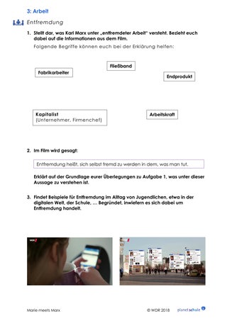 Die Schülerinnen und Schüler befassen sich mit dem Begriff der Entfremdung. Sie erklären dabei zunächst anhand der Aussagen aus dem Film, was Karl Marx unter Entfremdung verstand. Anschließend übertragen sie die Erkenntnisse und suchen Beispiele für Entfremdung in ihrer Lebenswelt.