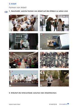 Die Lerngruppe schaut gemeinsam den Film. Anschließend erhalten die Schülerinnen und Schüler Screenshots aus dem Film auf Arbeitsblatt 2, auf denen verschiedene Formen von Arbeit zu sehen sind. In Partnerarbeit tauschen sie sich darüber aus, welche das sind und wie sie sich unterscheiden.