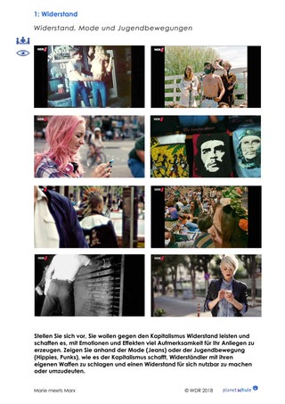 Zum Einstieg schaut die Lerngruppe den Film. Darin wird deutlich, wie selbst ursprünglich revolutionäre Symbole im Kapitalismus zu modischen Accessoires umgedeutet werden. Anhand von Screenshots aus dem Film überlegen die Schülerinnen und Schüler, welche Auswirkungen das auf Widerstandsbewegungen hat.