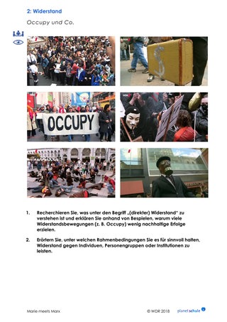 Wie ist der Begriff Widerstand eigentlich definiert? Warum haben Widerstandsbewegungen so wenig nachhaltige Erfolge? Und: Unter welchen Rahmenbedingungen kann Widerstand überhaupt gerechtfertigt sein? Damit beschäftigen sich die Schülerinnen und Schüler unter anderem am Beispiel von Occupy. Andere gesellschaftliche Widerstandsbewegungen können in die Überlegungen einbezogen werden, zum Beispiel die Gelbwesten-Bewegung in Frankreich.
