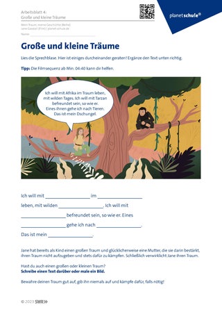 Arbeitsblatt 4 thematisiert Janes Traum und ermutigt die Schüler:innen, sich ihrer eigenen Träume bewusst zu werden, diese in Form eines Textes oder Bildes festzuhalten, um sich stets daran erinnern zu können und dafür zu kämpfen, dass sie in Erfüllung gehen.