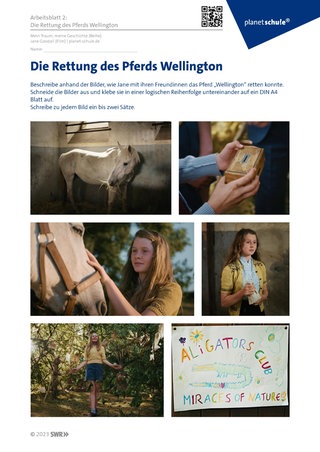 Arbeitsblatt 2 thematisiert die Geschichte der Rettung des Pferdes Wellington. Diese Geschichte zeigt exemplarisch auf, dass auch Kinder mit wenigen (finanziellen) Mitteln etwas bewirken können. Daher sollen die Schüler:innen die Geschichte anhand der Bilder rekonstruieren und nacherzählen.
