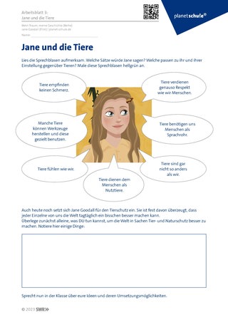 Auf Arbeitsblatt 3 befassen sich die Schüler:innen mit Janes Einstellung zu Tieren, aber auch ihrer Überzeugung, dass jeder Einzelne die Welt verbessern kann. Sie überlegen letztlich, welchen Beitrag sie selbst in Sachen Tier- und Naturschutz leisten können. Diese Ideen sowie deren Umsetzungsmöglichkeiten sollten im Plenum gesammelt und besprochen werden.