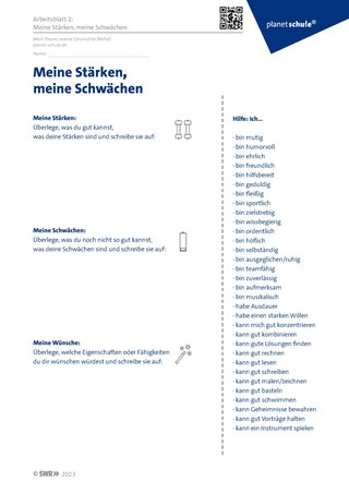 Ausgehend von ihren individuellen Interessen und Vorlieben sollen sich die Schüler:innen ihrer Stärken und Schwächen bewusst werden sowie ihre Wünsche in Bezug auf Eigenschaften und Fähigkeiten formulieren. Hierzu bearbeiten sie Arbeitsblatt 2 in Einzelarbeit.