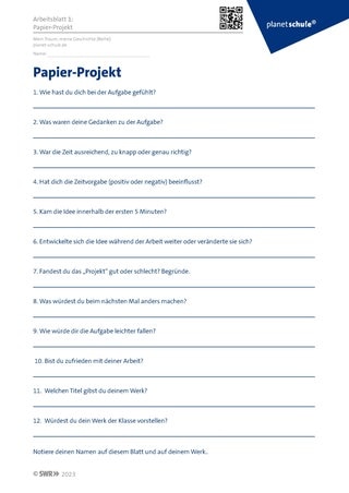 Alle Schüler:innen legen ihre Materialien und Papierwerke zunächst unkommentiert beiseite und erhalten Arbeitsblatt 1. Nach dem Ausfüllen von Arbeitsblatt 1 in Einzelarbeit werden alle Fragen nacheinander im Plenum besprochen, die unterschiedlichen Antworten der Schüler:innen gesammelt und gegebenenfalls diskutiert. Die Lehrkraft kann hier an geeigneten Stellen ihre Beobachtungen schildern, sollte jedoch in jedem Fall den Sinn des „Papier-Projektes“ sowie die wichtige Botschaft „Sei du selbst, denn du bist gut, so wie du bist!“ kurz darstellen:
