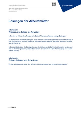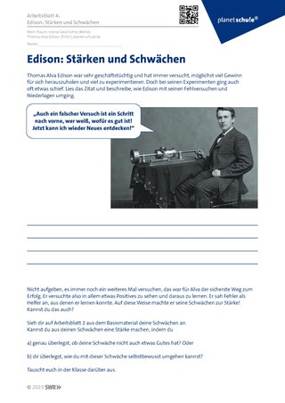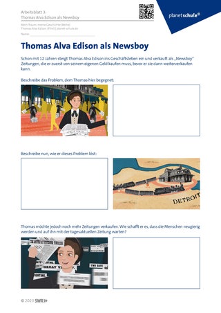 Auf Arbeitsblatt 3 befassen sich die Schüler:innen mit Thomas Alva Edisons frühem Einstieg ins Berufsleben und den Hindernissen und Hürden, denen er dabei begegnete, sowie seinem lösungsorientierten Vorgehen. Sie lernen, dass er niemals aufgab und immer nach Lösungen für Probleme suchte. Dies sollte im gemeinsamen Gespräch besonders hervorgehoben werden, da seine positive Grundeinstellung auch auf Arbeitsblatt 4 verdeutlicht und vertieft wird: Die Schüler:innen sprechen über das Zitat aus dem Film und überlegen sich, wie Thomas Alva Edison mit Niederlagen umging.