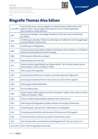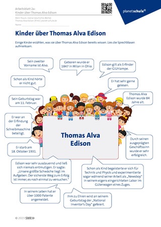 Auf den Arbeitsblättern 2a und 2b lernen die Schüler:innen Thomas Alva Edison näher kennen, indem sie Aussagen über ihn in einem Steckbrief strukturieren. Ein gemeinsames Gespräch im Plenum überprüft nicht nur die Arbeitsergebnisse, sondern dient dazu, dass die Kinder darüber sprechen können, welche Errungenschaften des großen Erfinders, aber auch welche Eigenschaften von Thomas Alva Edison sie besonders beeindruckend finden. Hierbei kann bereits angesprochen werden, dass Thomas Alva Edison auch sehr viele Rückschläge und Niederlagen ertragen musste, er also nicht nur Stärken, sondern auch Schwächen hatte.