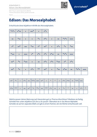Auf Arbeitsblatt 5 entschlüsseln die Schüler:innen zunächst in Einzel- oder Partnerarbeit Adjektive, die gut zu Thomas Alva Edison passen, um anschließend eigene Adjektive zu finden und zu verschlüsseln, die gut zu ihnen selbst passen. Ein:e Partner:in soll diese entsprechend entschlüsseln.